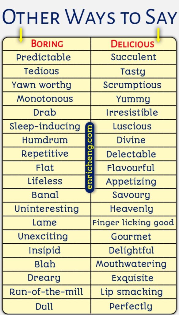 In this affirmative blog post we are going to teach you some alternatives of Boring and Delicious, this blog post contains other ways of saying boring and delicious. Don’t use a same word again while speaking you can use their alternatives or similar words. It helps you to have a formal and good accent while talking to someone or while having a written note always use the alternatives to impress the listener, reader or checker. This blog contains twenty ways to say boring and delicious.